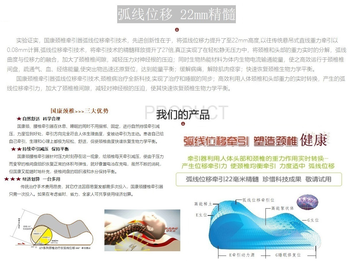 产品效果:当人体颈椎与牵引体弧面贴合时,当人体颈椎与牵引体弧面贴合时, 一推/一拉立即产生弧线位移力,位移牵引力高22mm;使颈椎椎节被均衡牵开, 力度更适中更安全方便,充分利用自然休息和睡眠时间,恢复颈椎生物力平衡。
